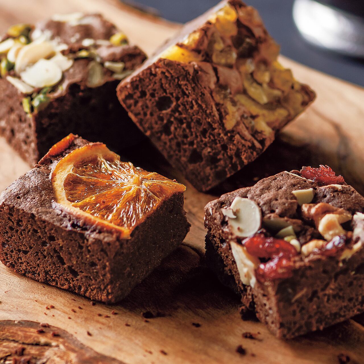 濃厚なチョコレートの生地に、香ばしいナッツや甘酸っぱいフルーツをトッピング。ピスタチオとアーモンド、ごろっとしたパイナップルやネーブル、たっぷりのドライフルーツとナッツ…。おいしさをぎゅっと詰め込んだキューブが、お口に小さなしあわせをお届けします。