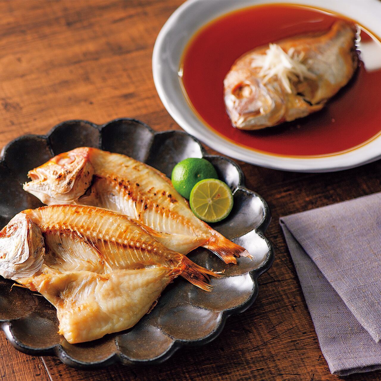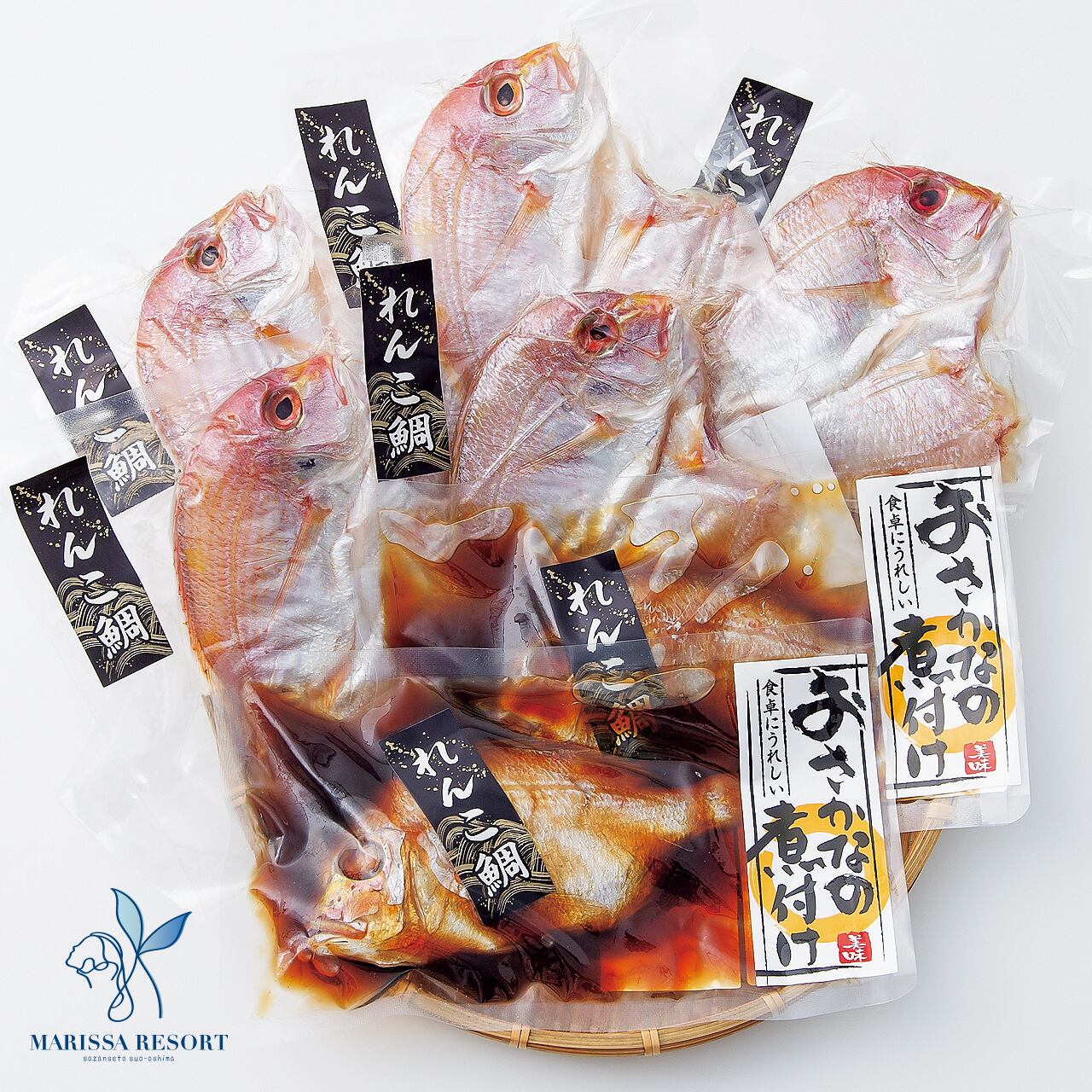 下関漁港水揚げの連子鯛(キダイ)はクセのない上品な味わいが特長。旨みを凝縮した一夜干しと、袋のままお湯で温めるだけで食べられる便利な煮付けのセットです。