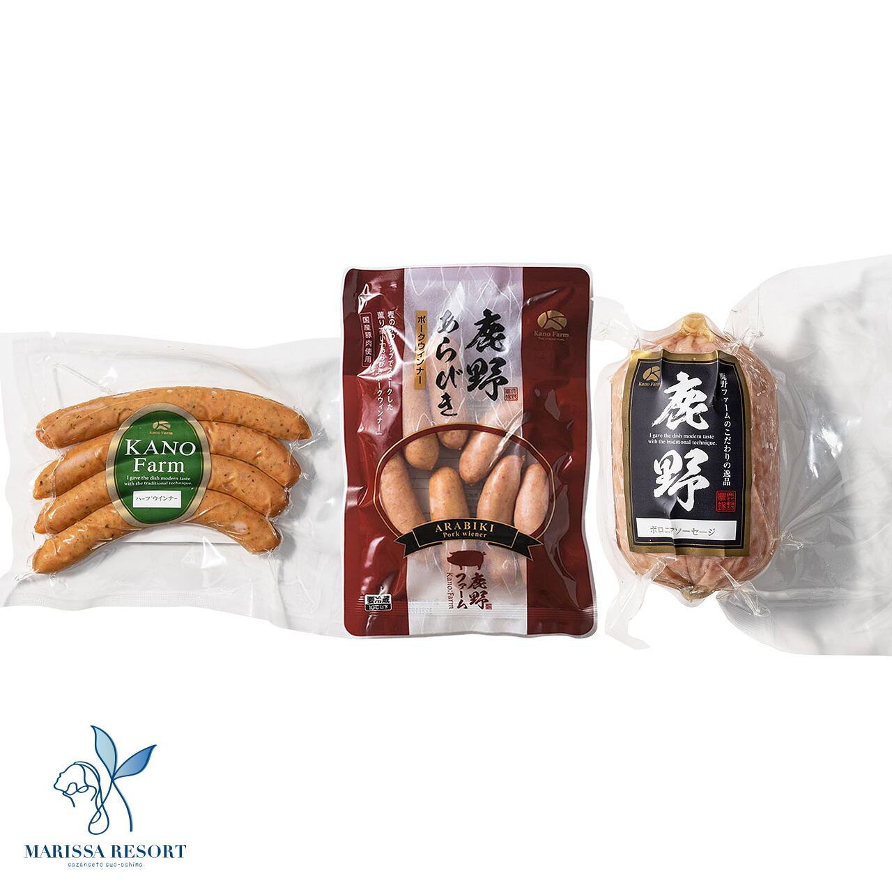 ボロニアソーセージ250g、あらびきポークウインナー140g、ハーブウインナー120g