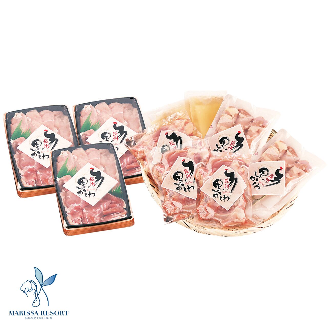 長州黒かしわもも肉・むね肉切身250g×3P、長州黒かしわ手羽もと開き170g(4本)×3袋、長州黒かしわもも・むね串1袋(40g×3本)×2袋、長州黒かしわガラスープ100g×2袋