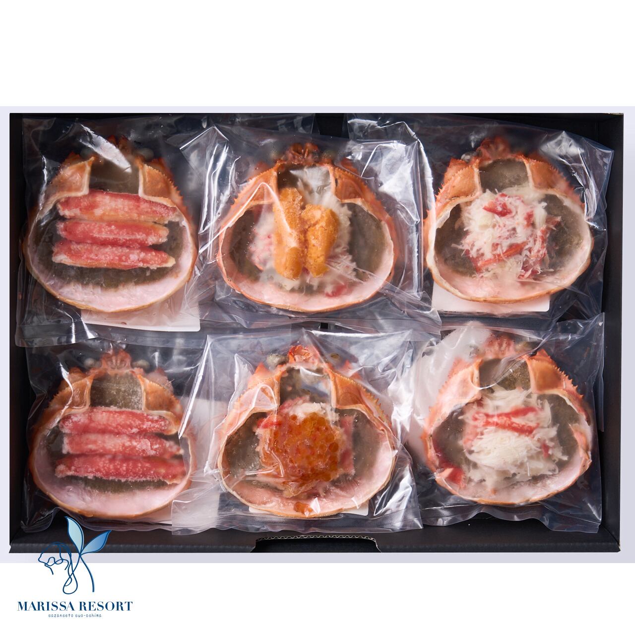 かにみそ甲羅盛り(かに脚肉のせ2個、かにほぐし身のせ2個、かにほぐし身・いくらのせ1個、かにほぐし身・うにのせ1個)(計6個)