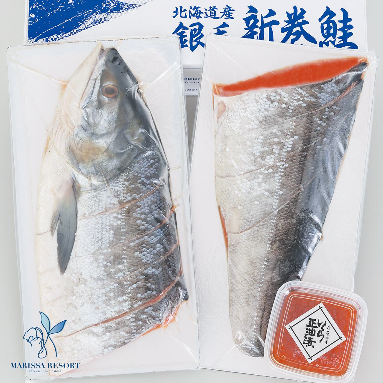 銀毛新巻鮭 姿半身600g(二分割)、北海道産いくら醤油漬60g