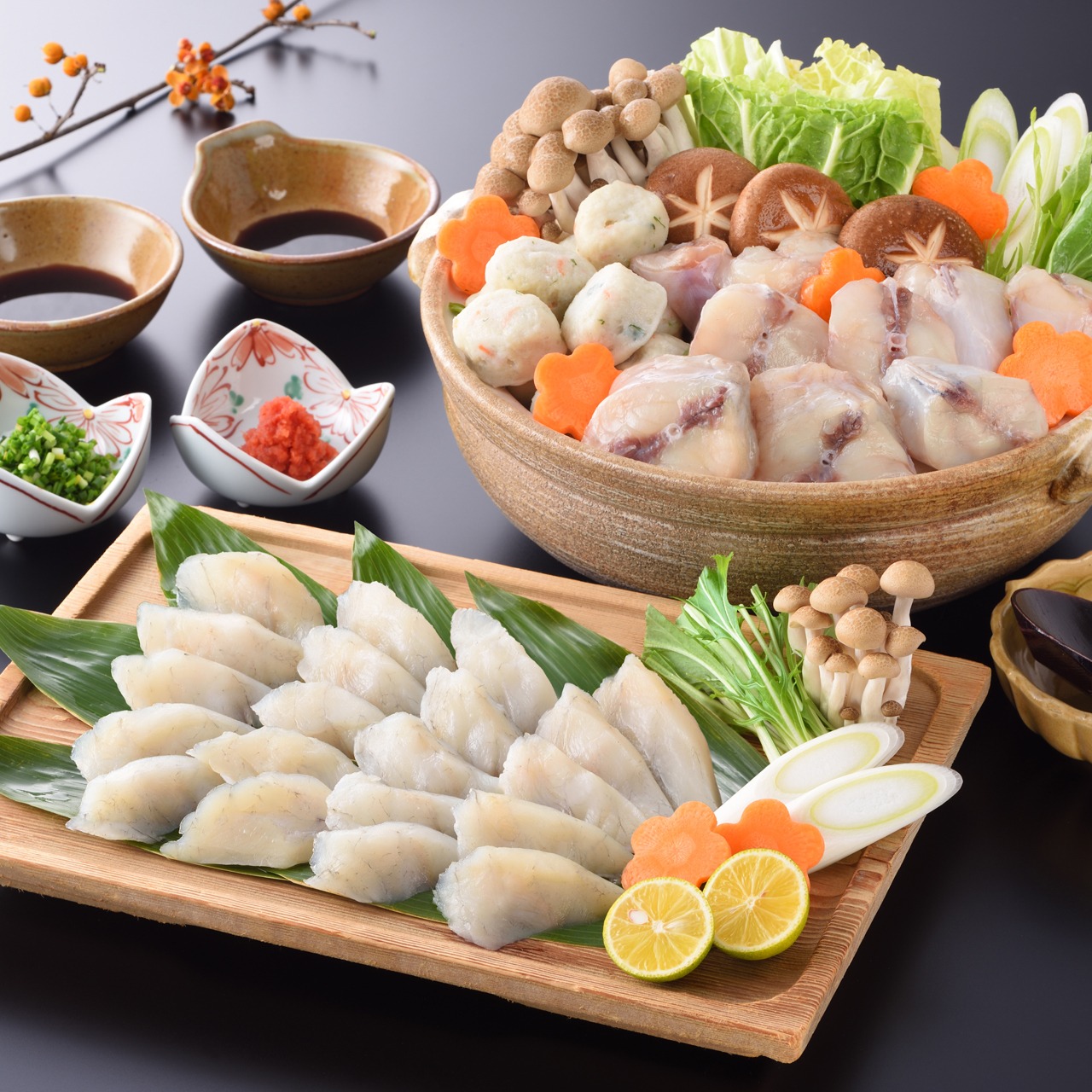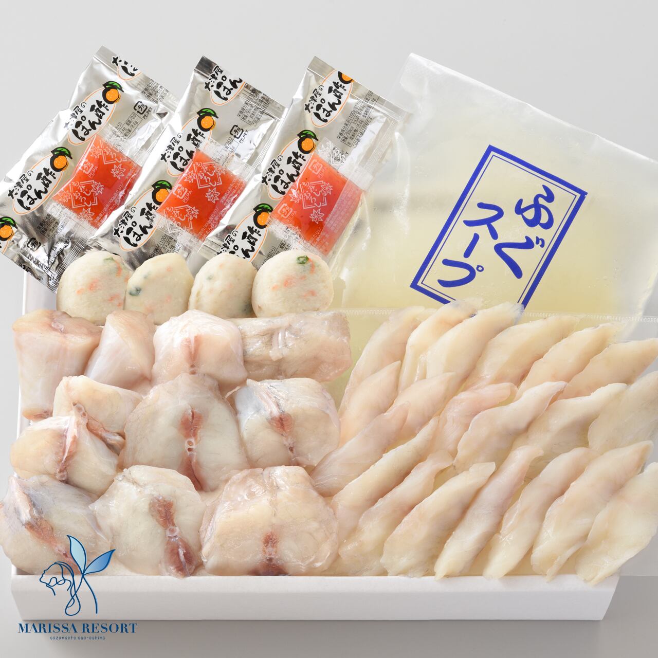 真ふく切り身300g×1、真ふくスライス100g×1、ふく入りつみれ×4個、ふぐスープ500g×1、ぽん酢30ml×3、もみじおろし5g×3
